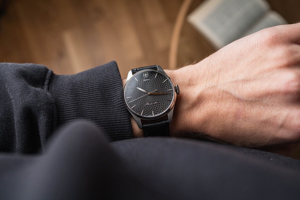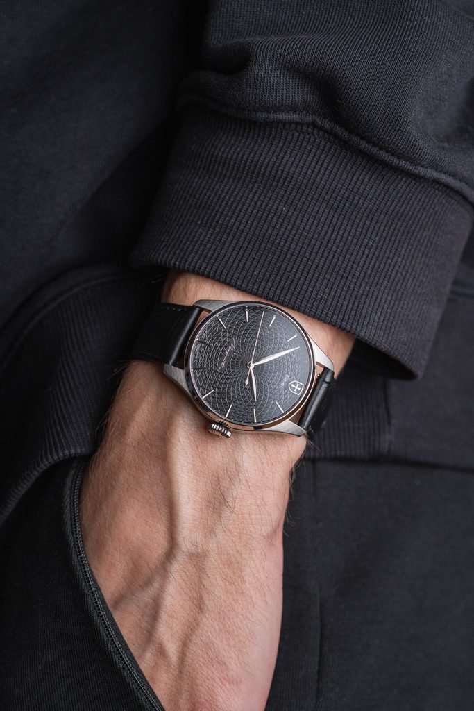 The black guilloche dial with a circular 3D pattern, featuring polished indices and hands, is protected by a sapphire crystal that is maximally scratch-resistant. Readability in bright light is ensured by a double-sided anti-reflective coating. The water resistance of this watch is 100 m (10 ATM), so it can handle contact with water such as showers and rain as well as swimming. On the wrist, the watch is held by a calfskin strap with black stitching.