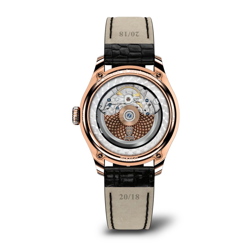 The model is available in two variants. Namely, on a black alligator leather strap measuring 20mm wide and 4.5mm thick, or a metal bracelet with a rose gold-plated finish.