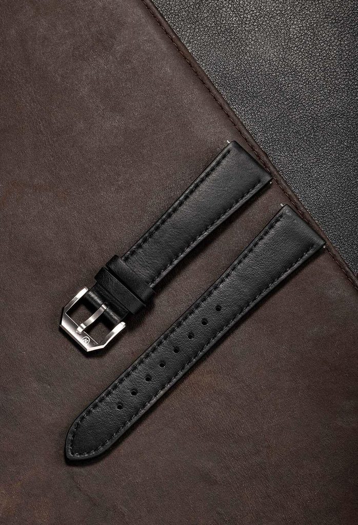 The black leather strap is made of high quality Italian leather from Mastrotto tannery. It has classic stitching along the entire length of the strap that will easily complement any outfit you choose for it and your watch. The strap is 20mm wide and gradually tapers to 18mm at the buckle for added wearing comfort. The strap is equipped with quick release buckles for easier replacement.