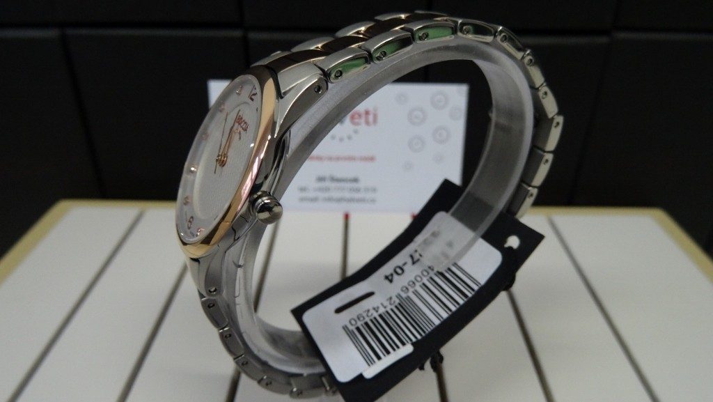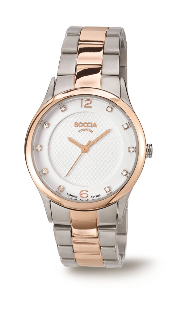 The Boccia Titanium 3227-04 women's watch features a round titanium case that houses a double-backed dial. The outer white part of the dial features index numbers and decorative rhinestones. The inner part of the dial features an elegant grid. Everything is protected by a sapphire crystal. The lunette and the inner part of the bracelet are gilded with PVD finish. The watch comes with a titanium bracelet.
