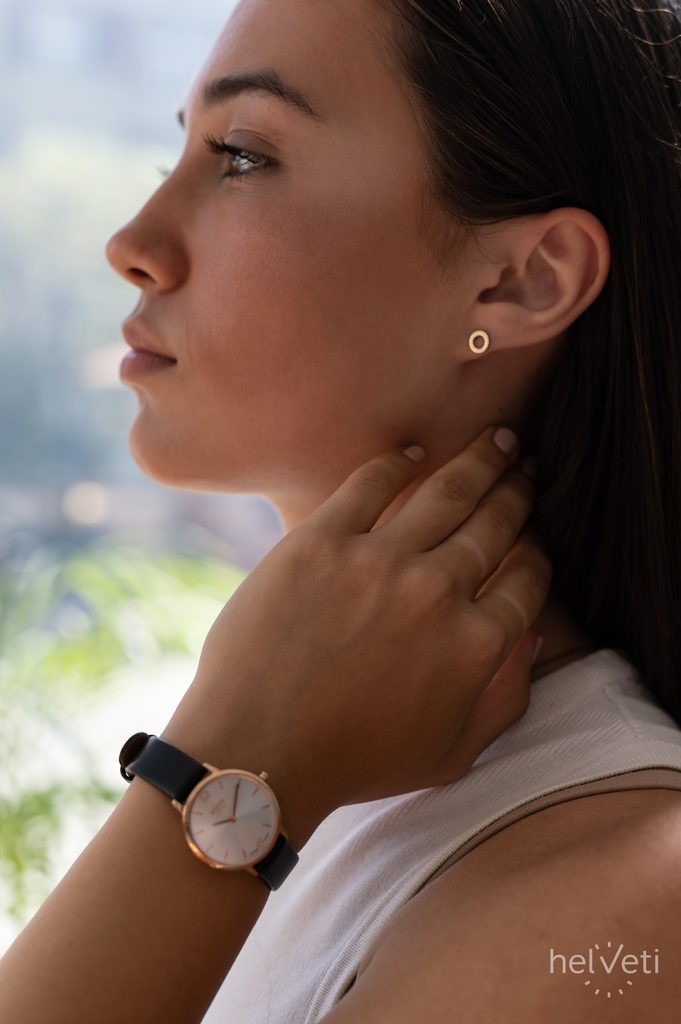 The watch has a 27.5mm diameter titanium case with a rose gold PVD finish. The model impresses mainly with its clear and simple dial with a metallic effect. On the hand, the watch is held thanks to a high-quality leather strap with a practical thorn buckle.