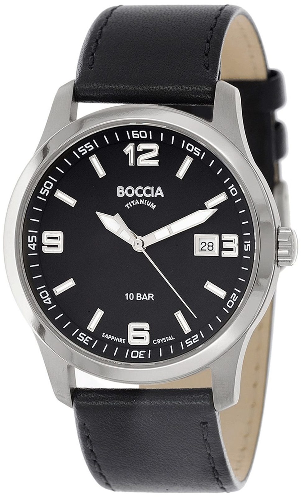Decent men's social watch with a clear dial, date display and a minimum of functions. The Boccia Titanium 3626-02 offers a classic look, sapphire crystal, luminescence and 10 ATM water resistance. The medium-sized titanium case stays on the wrist thanks to the black leather strap.