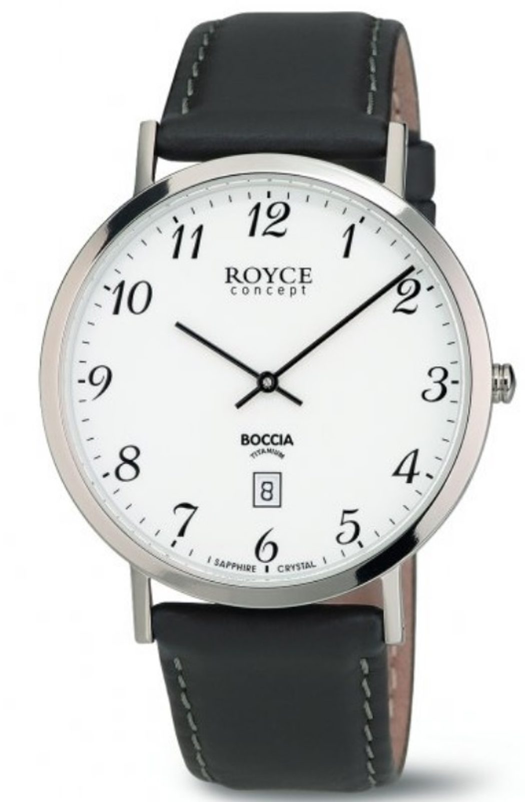Men's Boccia Titanium 3634-01watch belongs to the ROYCE model series. The watch has a round titanium case and is held on the wrist by a leather strap.