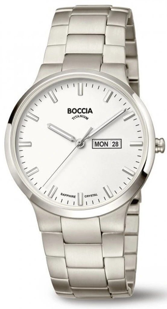 Thanks to its features, the Boccia Titanium 3649-01 is suitable for both social and leisure activities. The white dial is protected by a sapphire crystal, which is highly resistant to scratches. Water resistance is 50 m, so the watch can handle normal contact with water such as hand washing, rain or showering. A nice bonus is the luminescence on the hands and indices. At the usual position 3 is the date and day of the week display. The case size is 39 mm, so the watch will fit most men's wrists.
