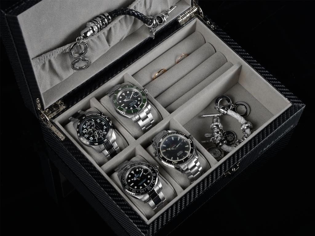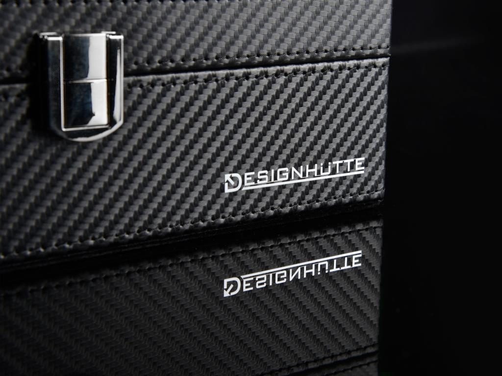 Watch case Designhütte Dallas 4+ 70005-200 for 4 watches and jewellery. The watch and jewellery boxes from the Dallas series impressively combine elegance and functionality. The robust and high-quality surface material with a dark carbon look gives the case an elegant and high-quality appearance.