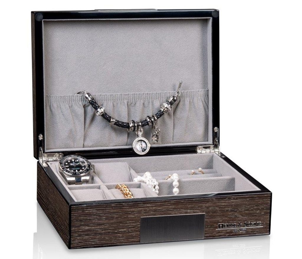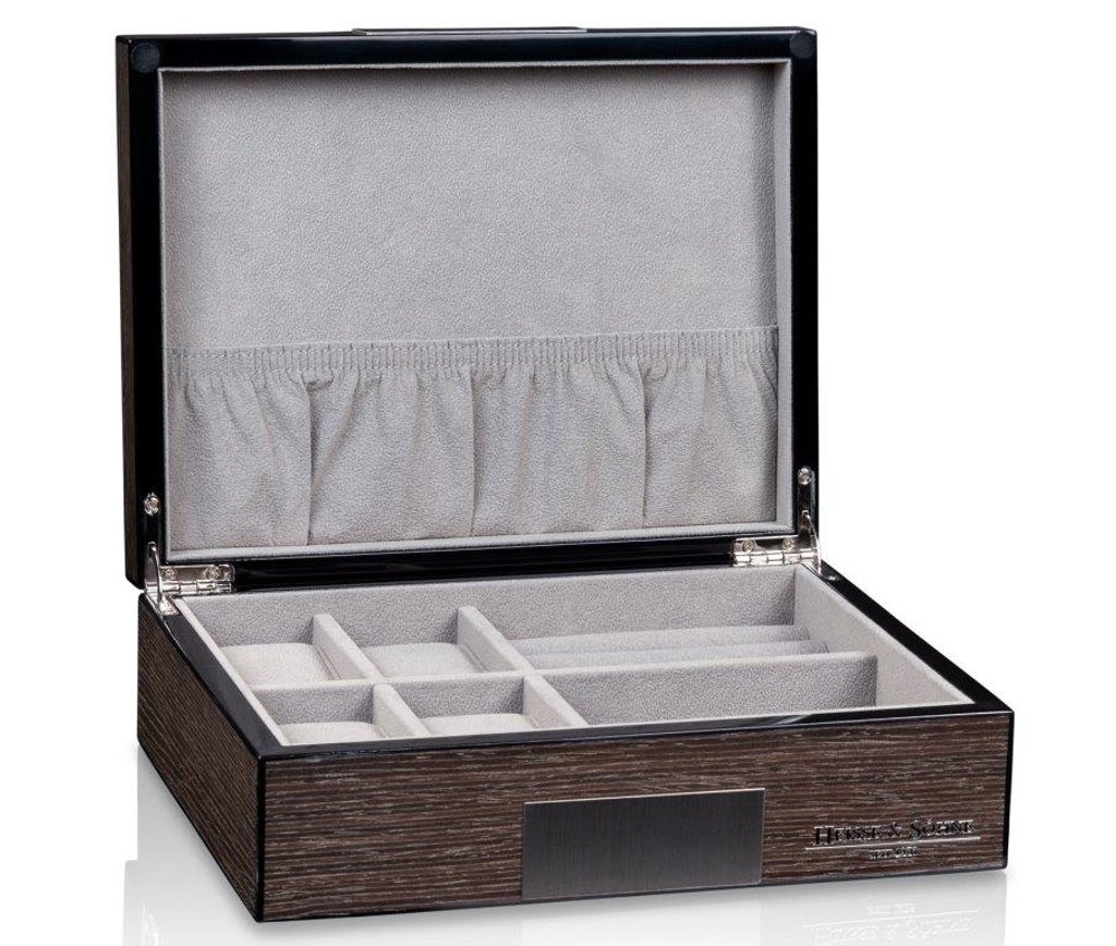 Watch and jewellery box Heisse & Söhne Leo 4 70019-193.164 for 4 watches and other valuables. The watch and jewellery box from the Leo series combines timeless elegance and maximum functionality in an outstanding design. The dark Ginko veneer gives the box a luxurious, natural look, while the light grey interior creates a fascinating contrast and completes the design in style.