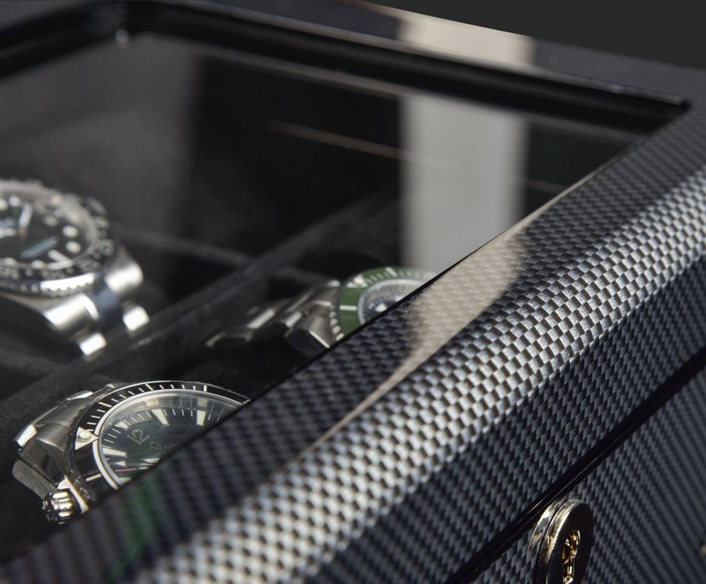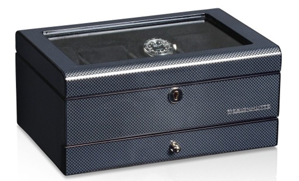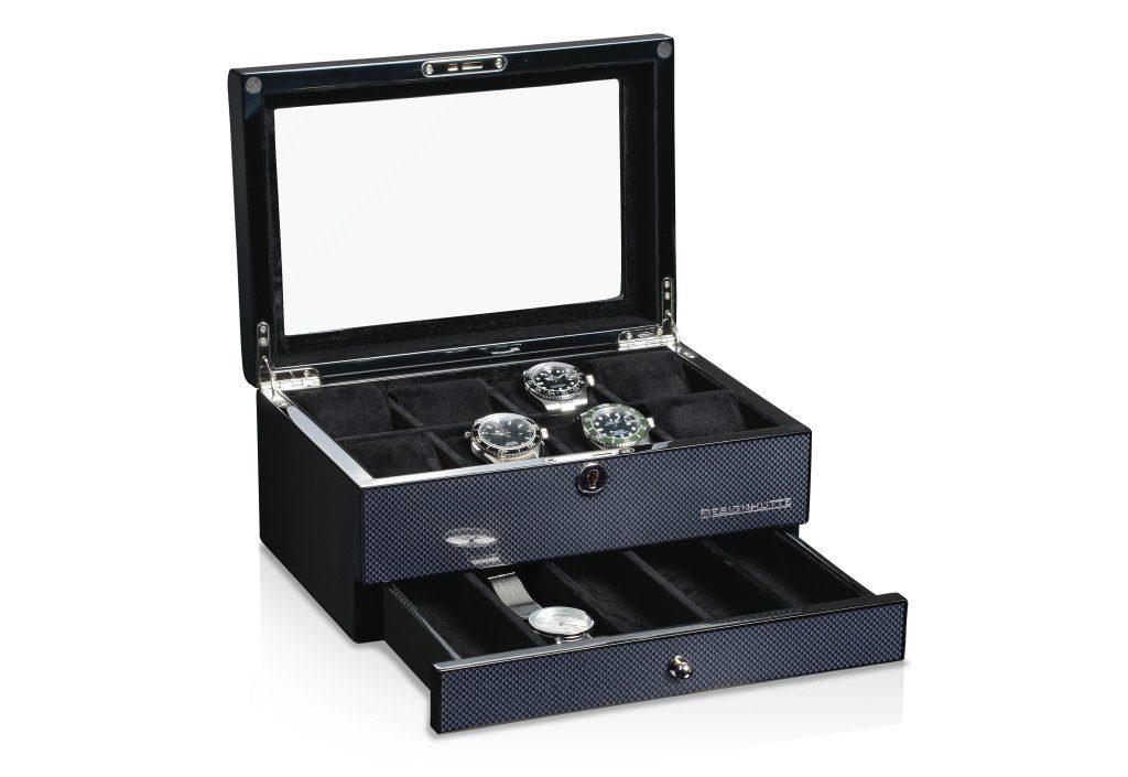 Designhütte Chicago 8+ 70005-06 watch box for 8 watches. The watch cases from the Chicago series impress with their sporty, elegant design and dynamic look. The high-gloss finish in a carbon look, inspired by racing design, gives the boxes a stylish look. The chrome-plated lock not only ensures security but also highlights the high-quality finish.