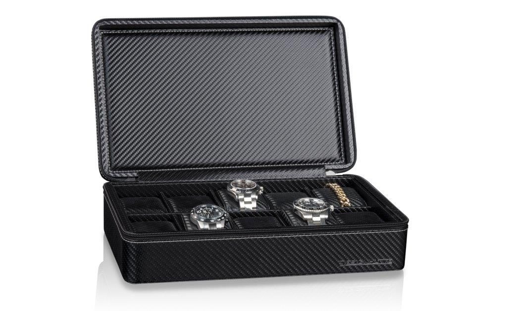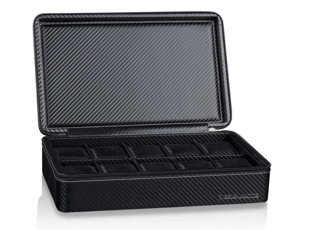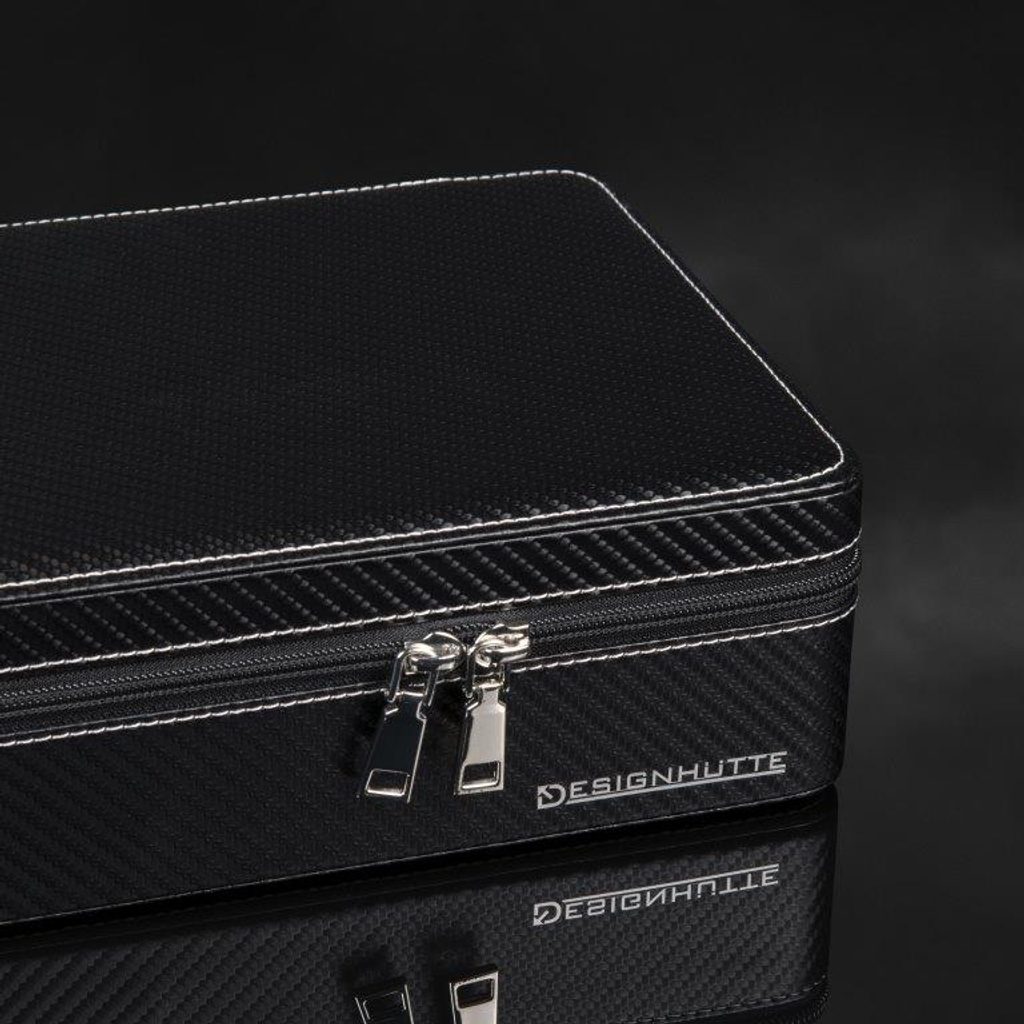 Watch case Designhütte Tampa 10 70005-213.146 for 10 watches. The watch cases from the Tampa series combine sporty elegance and functionality. The sleek carbon look gives these boxes a modern, dynamic character that fits perfectly with a sporty lifestyle. The high-quality, lightly lined imitation leather gives a premium impression both to the eye and to the touch. The soft pads inside ensure that the watch is safe and secure while being protected from scratches and wear and tear.