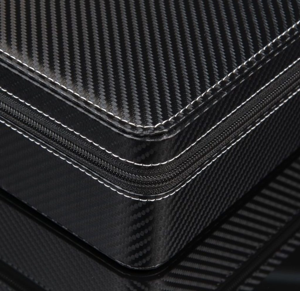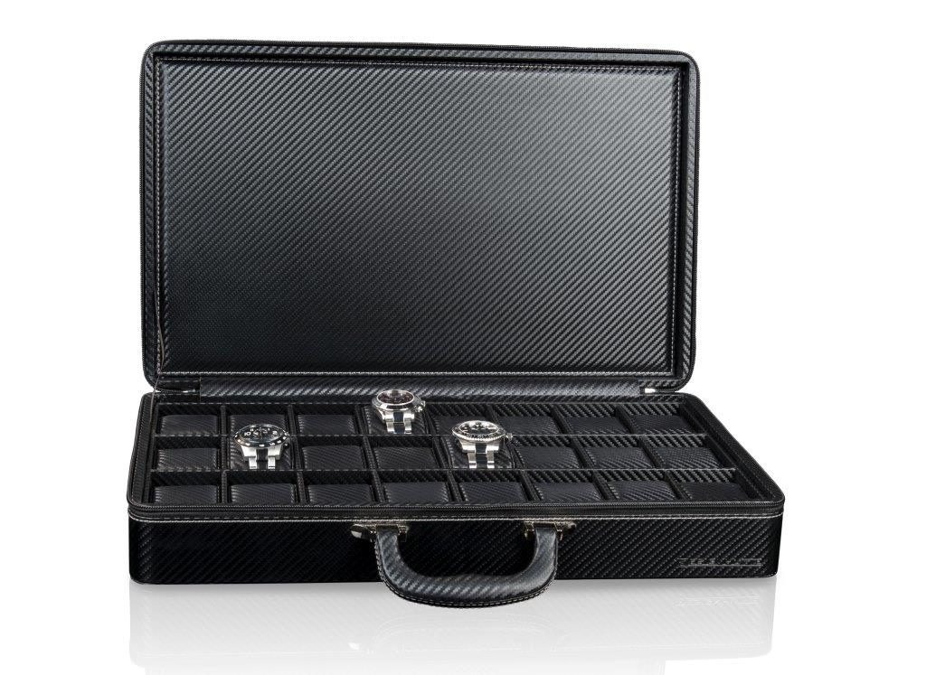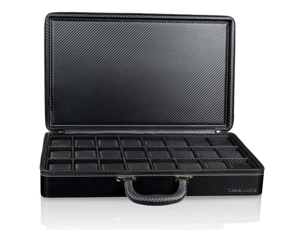 Watch case Designhütte Tampa 24 70005-214.146 for 24 watches. The watch cases from the Tampa series combine sporty elegance and functionality. The sleek carbon look gives these boxes a modern, dynamic character that fits perfectly with a sporty lifestyle. The high-quality, lightly lined imitation leather gives a premium impression both to the eye and to the touch. The soft pads inside ensure that the watch is safe and secure while being protected from scratches and wear and tear.