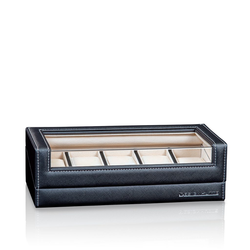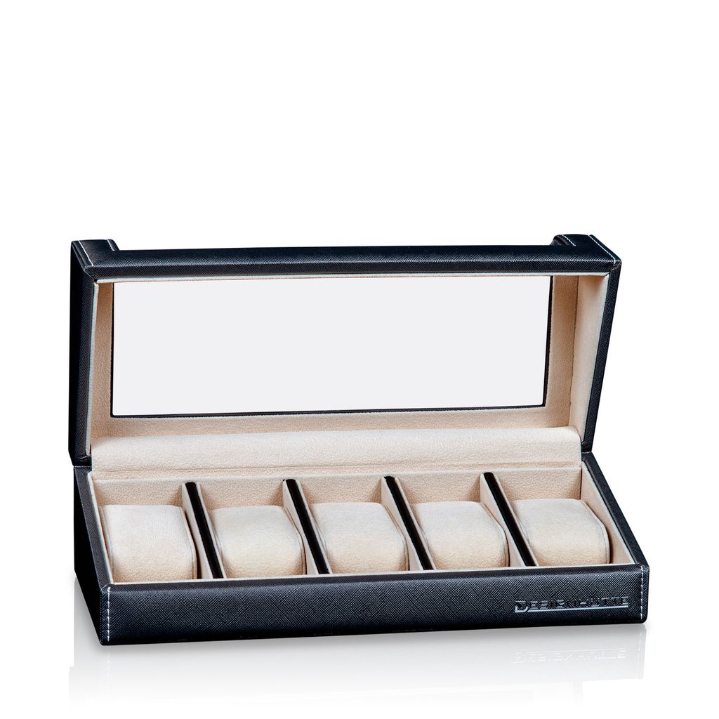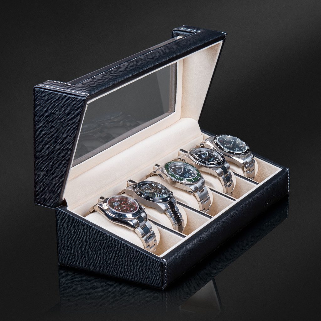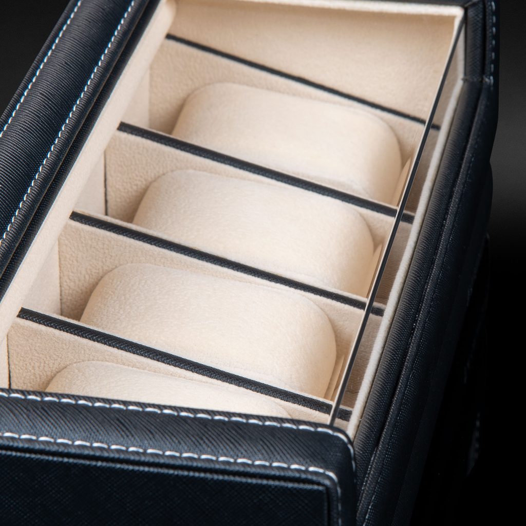 The Venice watch cases offer space for up to ten watches and are the ideal choice for collectors with a taste for style. Covered in high-quality imitation leather with an elegant Saffiano look and fine white decorative stitching, they embody timeless sophistication. Inside, velvet velour reliably protects the watch from scratches, while the generous acrylic glass case allows the watch to be presented in style while protecting it from dust.