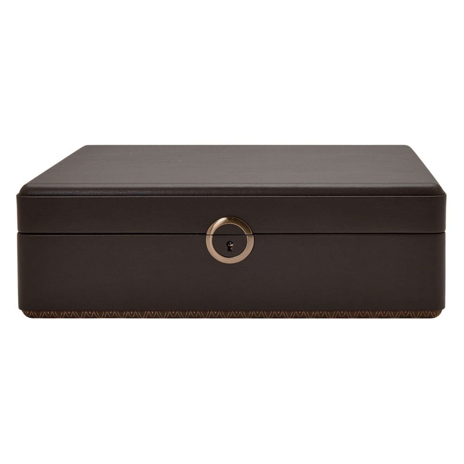 The box offers storage space for 5 watches, a removable tray with compartments for additional valuables and a removable round zipped pouch.
