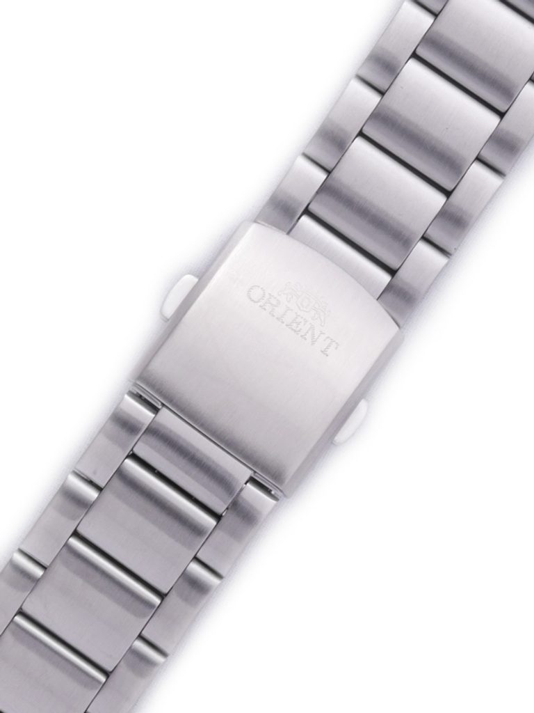 The original 22 mm wide Orient steel bracelet boasts a practical steel-coloured folding clasp and low maintenance. Its shiny finish also adds a touch of elegance to your watch.