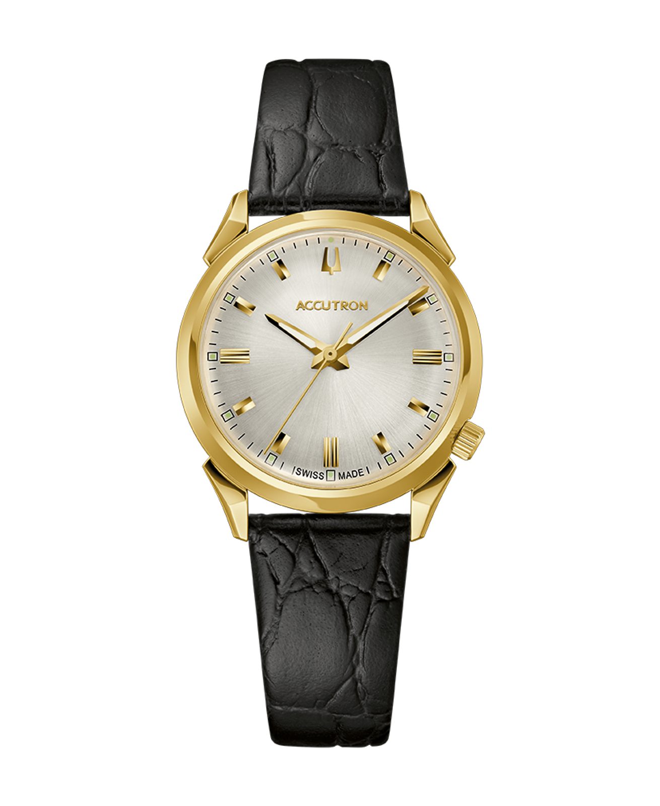 The watch case Bulova Accutron Legacy 2SW7A004 is made of stainless steel with PVD gold color finish. The crown marked with a tuning fork symbol will delight you with this watch. The case is complemented by a leather strap finished with a fold-over buckle. The watch is powered by Swiss mechanical movement Sellita SW200 with automatic winding, hacking function and crown winding option. With a running frequency of 28,800 semi-frequencies per hour, the machine can be observed thanks to the semi-transparent dial. The clear silver dial, made in the style of the 1960s, has an interesting retro feel, and is fitted with embossed indices at the hour positions and dauphine hands with luminescence. The dial is protected by an arched sapphire crystal with an anti-reflective coating, ensuring excellent legibility even in direct light. The water resistance of the model is 30 m, it can withstand contact with water during hand washing and rain. Teno model meets the conditions of the Swiss Made label. The case diameter with its 34 mm maintains the size of the original model.