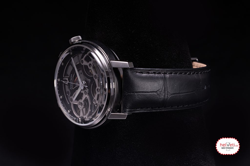 An unnoticeable element of the watch is its dial, which is formed by a view of the movement. The circumference of the dial is a circle with minute markings. The dial is finished in black with silver details and protected by a convex sapphire crystal. The watch case is made of stainless steel and is complemented by a black alligator leather strap, matching the colour of the dial. The diameter of the watch case is 43.5 mm. The water resistance of the watch, given its purpose, is a sufficient 50 m.