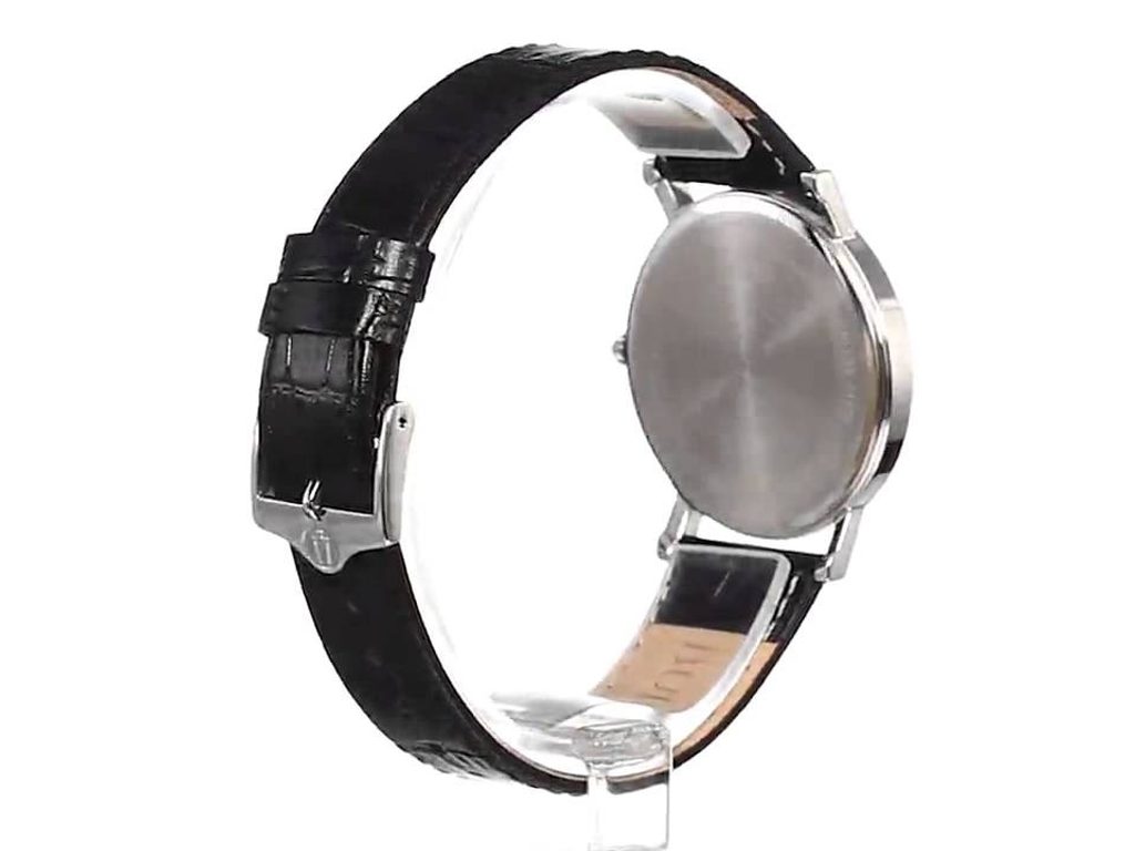 The smooth silver dial with a so-called sunburst cut, which underlies the embossed indices at the watch positions, is protected by a mineral crystal. The elegance of the model is underlined by the use of subtle handswithout a touch of luminescence and the aforementioned hour indexes in the same vein. The watch case is made of stainless steel and suitably complemented by a black leather strap with a crocodile skin pattern. The watch has a date display at the 3 o'clock position and water resistance of 30 m - it can withstand accidental contact with water during hand washing, rain.