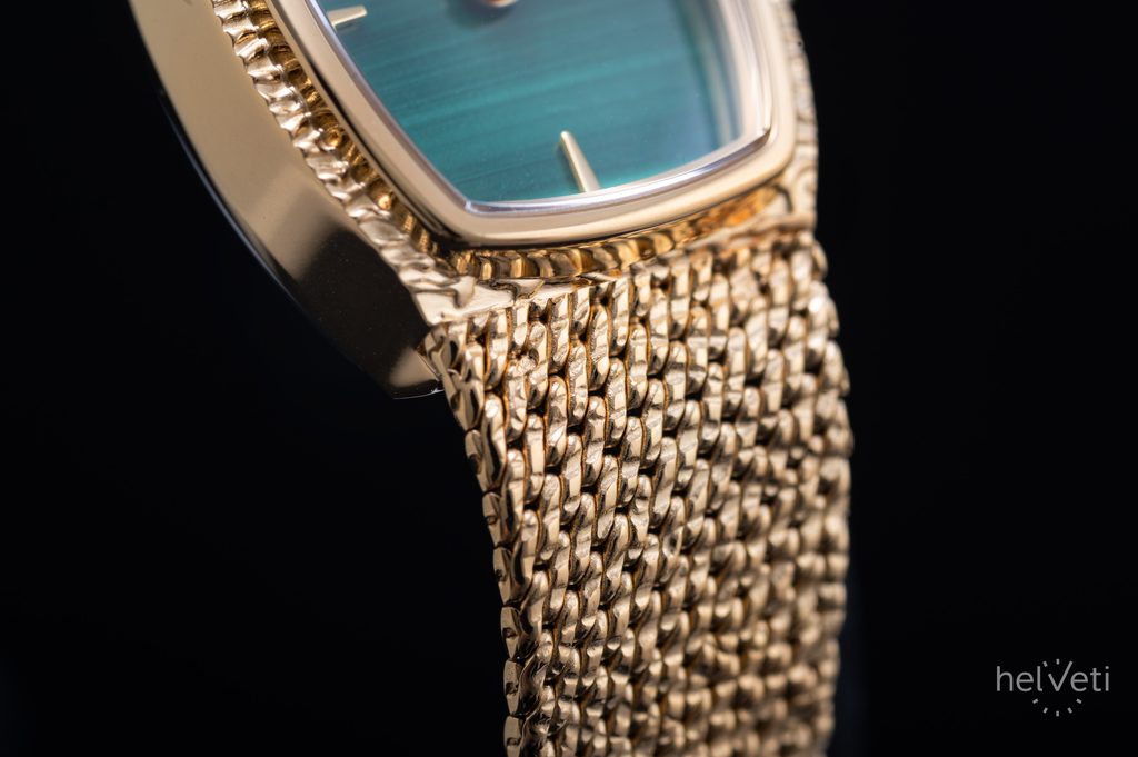 At first glance, the watch catches the eye with its petite , decorative tonneau-shaped case that flows seamlessly into a similarly sculpted bracelet. The case and bracelet are made of stainless steel with a gold PVD surface finish. The case and the braided metal bracelet are decorated with a subtle texture from which only the polished lunette stands out, giving the watch a sparkle. The wristband used not only looks interesting, but also adapts perfectly and ensures a comfortable wear all day long. Its length is easily adjusted by sliding the clasp.