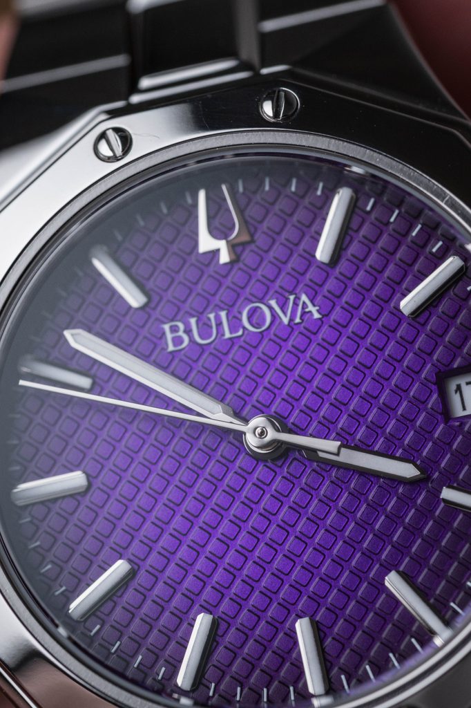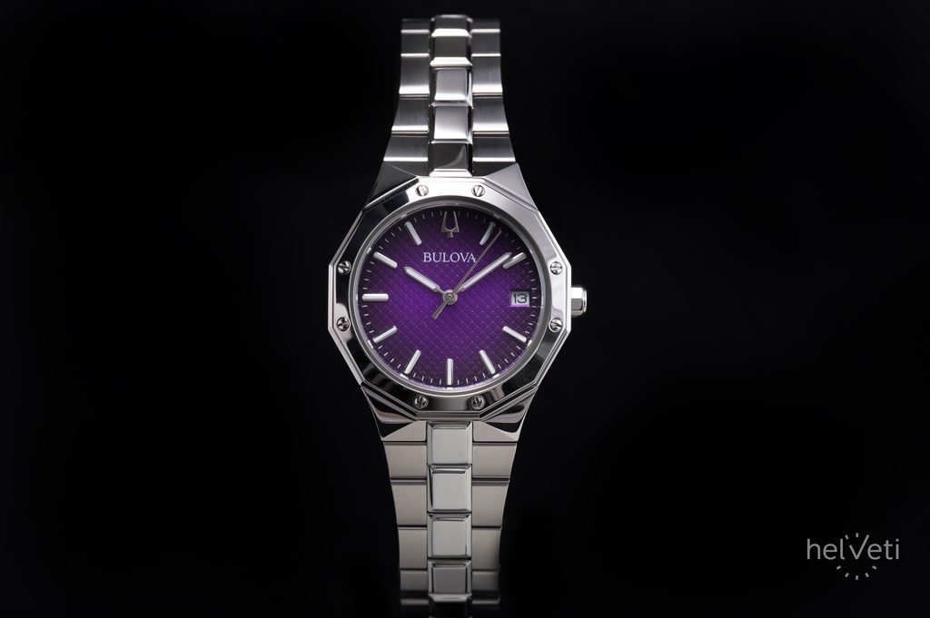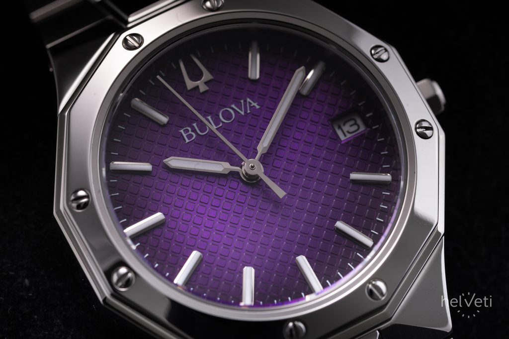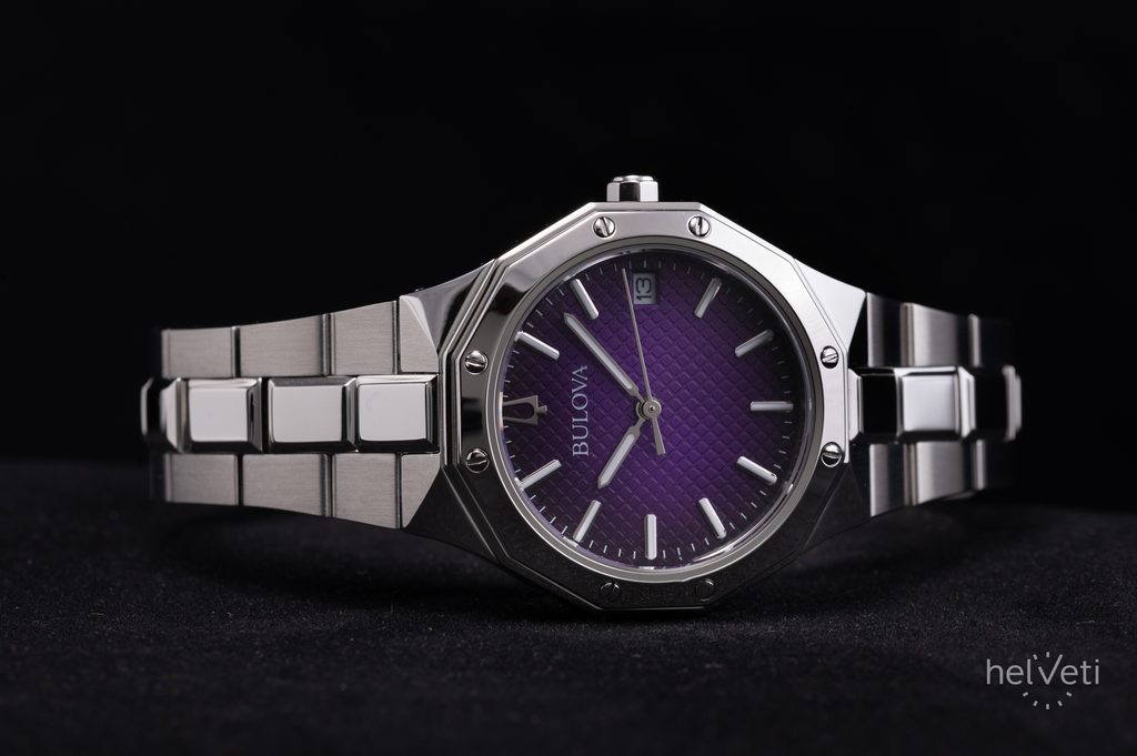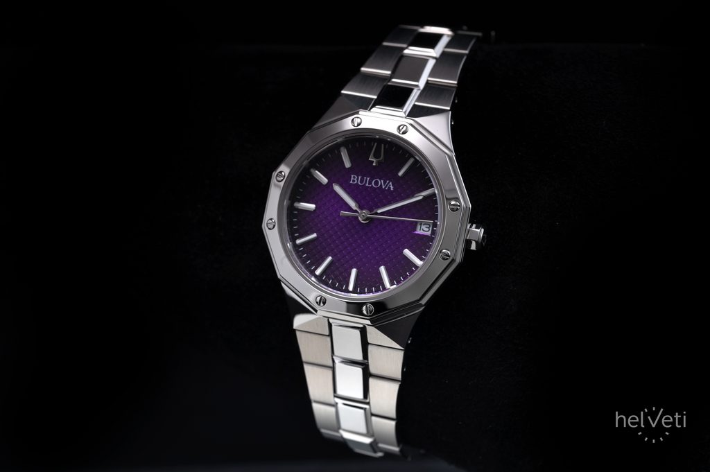 The Bulova Prestige 96M168 is a model from the Bulova Classic series. The watch impresses with its distinctive sporty and elegant style and the purple textured dial, which underlines the charm of the watch. The 12-sided lunette case is complemented by a link steel bracelet finished with a butterfly clasp.