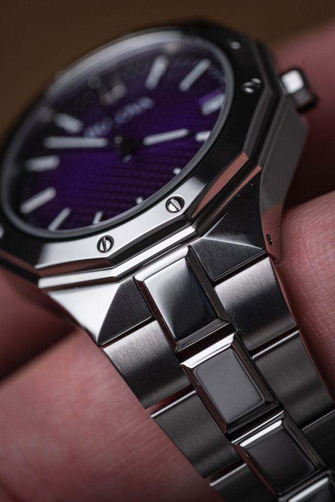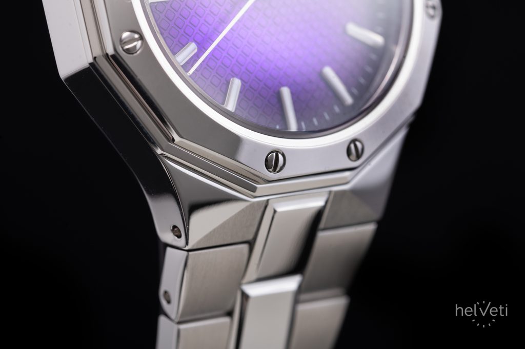 The syringe hands and applied indices at the hour positions stand out on the clear purple dial. It is protected by an anti-reflective sapphire crystal, which is scratch-resistant and easy to read even in direct light. The hands and indices of the watch are luminescent, making it easier to read the time in low light conditions. The watch is equipped with a date display at the 3 o'clock position.