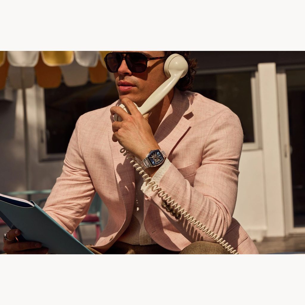 The skeleton dial with a distinctive blue openwork edge, which underlies the rose-gold embossed indices at the watch positions, is protected by an anti-reflective sapphire crystal. The dial is the unmistakable and main feature, allowing you to follow the delicate gears of the automatic movement. The view is not disturbed by the sensitively chosen hands, which, like the indices, are luminescent, making it easier to read the time in low-light conditions.