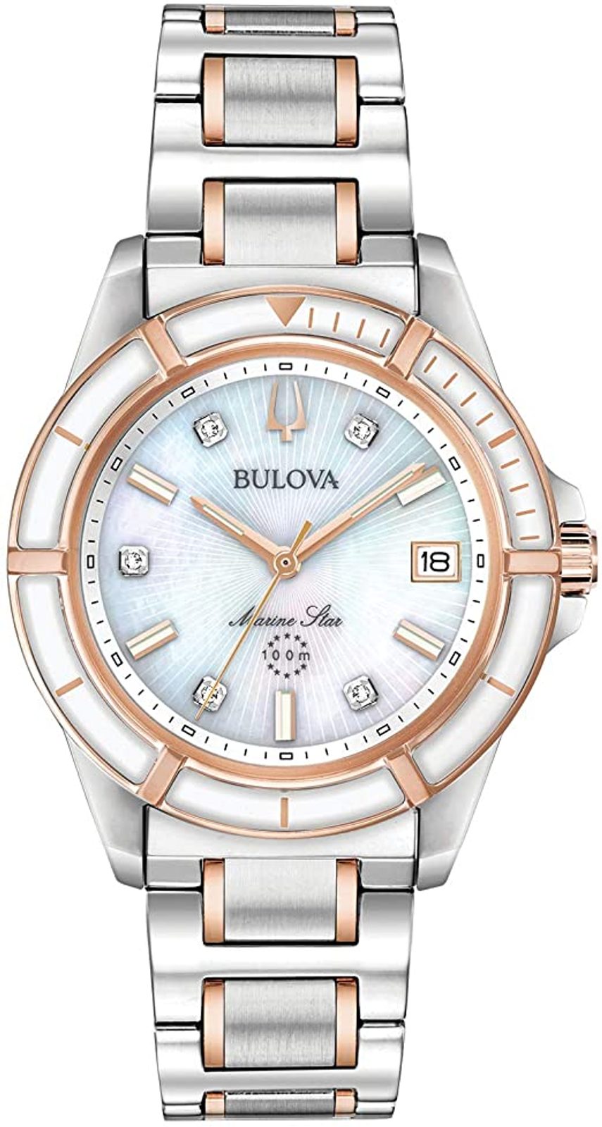The Bulova 98P187 is a model from the Marine Star series. The case and bracelet are made of stainless steel in bicolour. The fine hands and 5 diamonds at the hour positions stand out on the clear mother-of-pearl dial, protected by a mineral glass. The watch is equipped with a date function at the 3 o'clock position. For better legibility in low light conditions, the hands are equipped with luminescence. The watch is decorated with a lunette with ceramic inserts. The water resistance of this model is 100 m, so it is possible to swim with the watch. Due to the case diameter of 34 mm, it is a suitable choice for smaller women's wrists.
