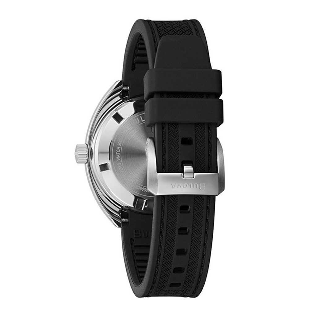 The case of the Bulova Oceanographer Devil Diver 96B350 is made of stainless steel and houses a Japanese Miyota mechanical movement with automatic winding. It offers a date display function at the traditional 3 position. Its excellent legibility is ensured by the peel on the slide (sometimes called the "cyclops"), which is somewhat unconventionally placed inside the slide. The case is dominated by a unidirectionally rotatable dive lunette in the colours of the dial.