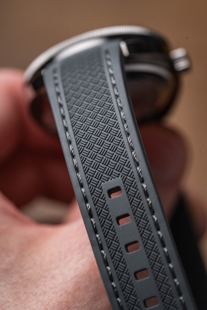 The 41 mm watch case is complemented by a comfortable black silicone strap. The case is finished with a gunmetal grey IP finish. The water resistance of the watch is 200 m, i.e. 666 feet, a value that also gave the watch its nickname"Devil Diver".