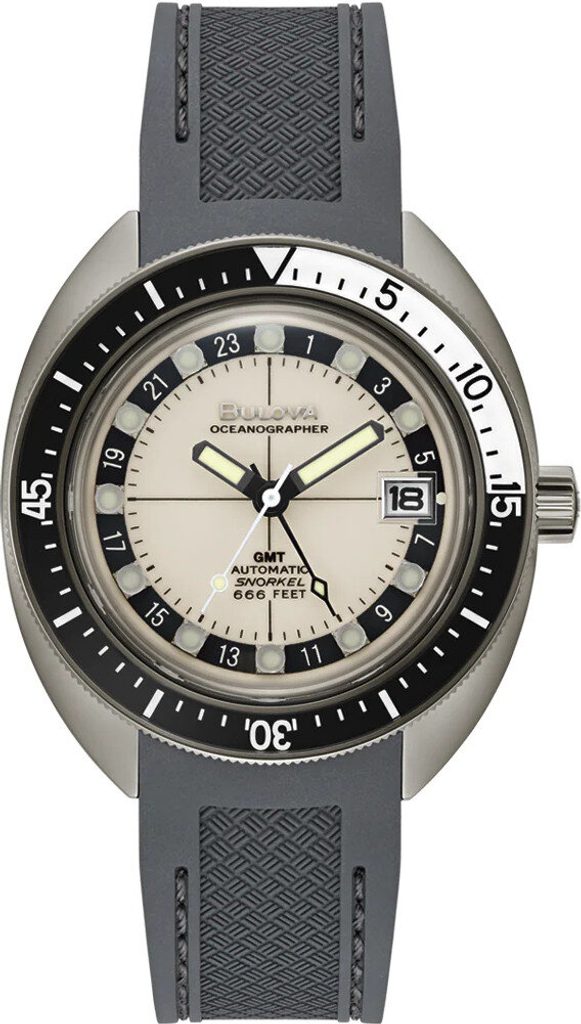 The case of the Bulova Oceanographer Devil Diver 98B407 is made of steel and houses a Japanese mechanical movement with Miyota 9075 automatic winding. This offers a GMT function, i.e. the ability to display a second time zone, in addition to the date display at the traditional 3 o'clock position. In this case, it is the so-called true/travel one, where the hour hand can be moved in separate hourly jumps. The 24-hour scale is displayed directly on the dial in this model.