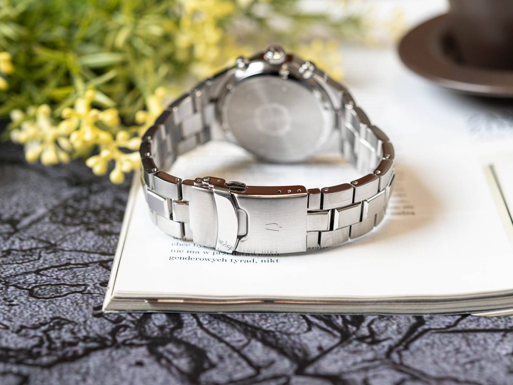 The watch is powered by an Ultra High Frequency (UHF) quartz movement operating at 262 kHz. This is roughly 8 times higher than that of conventional quartz movements (32768 Hz). As a result, it achieves high precision operation. Another interesting feature is the smooth operation of the second hand, which is typical of mechanical movements. The movement is equipped with a date function at the half past five position and also a stopwatch function. The stopwatch allows to measure up to 60-minute intervals (subdial at the 9 o'clock position) with an accuracy of 1/20th of a second (subdial at the 3 o'clock position), the control is classic - the top button starts and stops the stopwatch and the bottom one resets the measured values.