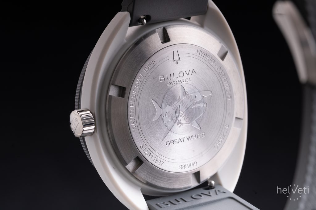 The Bulova Snorkel 98B449 Great White Shark watch is the next in line for the brand, bringing a playful and popular hybrid ceramic material watch. The Bulova Snorkel models come in a diver style and offer an increased water resistance of 100m. They are a great choice for revived collections, for summer, but also for everyday wear. The design of this model is based on the successful Bulova Oceanographer Snorkel from the 1970s.