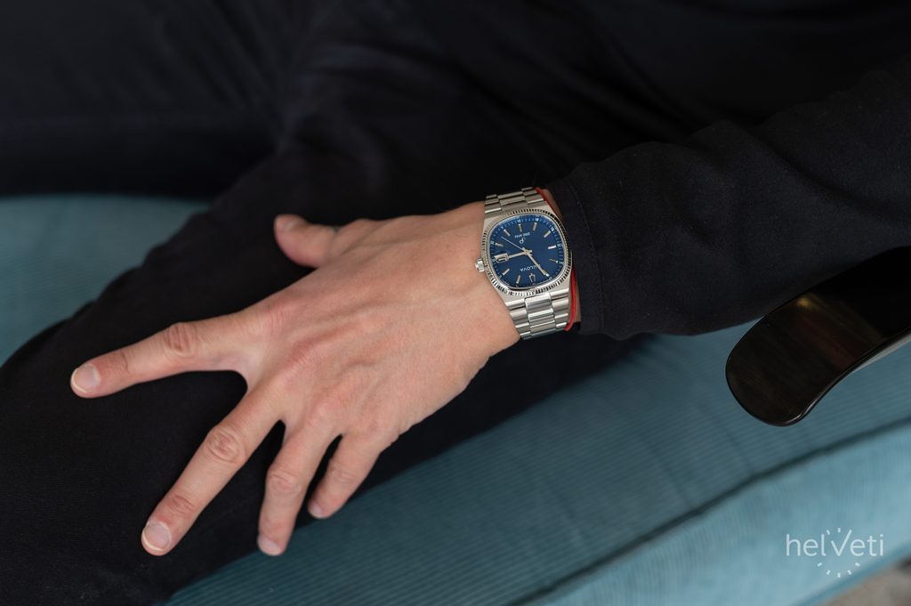 The blue cut dial, which underlies the plastic indices at the hour positions, is protected by a sapphire crystal with internal anti-reflective coating. In addition to the dial itself, the scalloped lunette is an unmistakable feature that adds a touch of elegance to the watch. On the silver hands and dots at the hour indexes we find luminescence, making it easier to read the time in low light conditions.