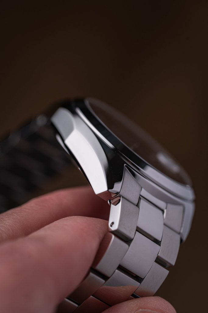 The watch is powered by a self-winding Miyota 8215 mechanical movement with a power reserve of around 42 hours. The movement offers a date function, which can be found at the 3 o'clock position. For better legibility, the glass above the date is equipped with a magnifying loupe. The movement's operation can be monitored through a glass escapement. The watch case and bracelet are made of stainless steel. The bracelet is finished with a decent butterfly. The watch will also look great on a leather strap. The water resistance of the watch is 30 m, so it can withstand contact with water when washing hands, rain.