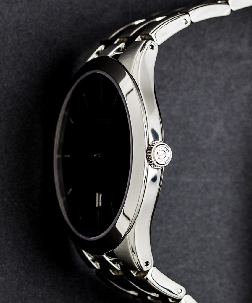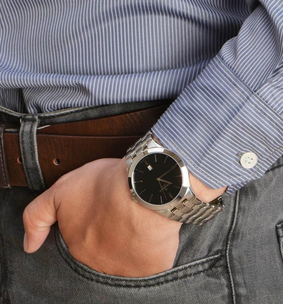 The luxury look of the watch is given by the stainless steel case and movement. At the 6 position there is a practical date display. The black dial is complemented by luminescent hands. All this is protected by a sapphire crystal, which is extremely scratch-resistant.
