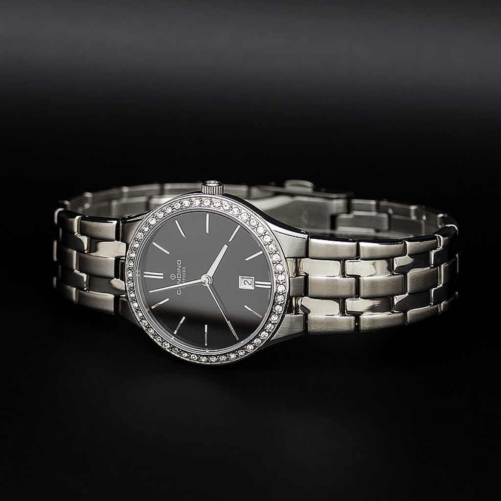 The luxury look of the watch is given by the stainless steel case and movement. Glittering rhinestones are set in the perimeter of the case. A practical date display is located at the 6 position. The black dial is complemented by luminescent hands. All this is protected by a sapphire crystal that is extremely scratch-resistant.