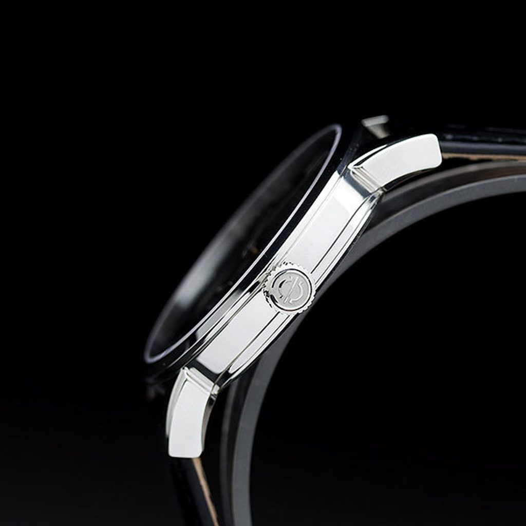 The water resistance of 5 ATM means that the watch will not be harmed by rain, hand washing or evening showers. The 40mm case diameter makes it a great fit on most men's wrists. The watch is easy to clip on thanks to the black leather strap.