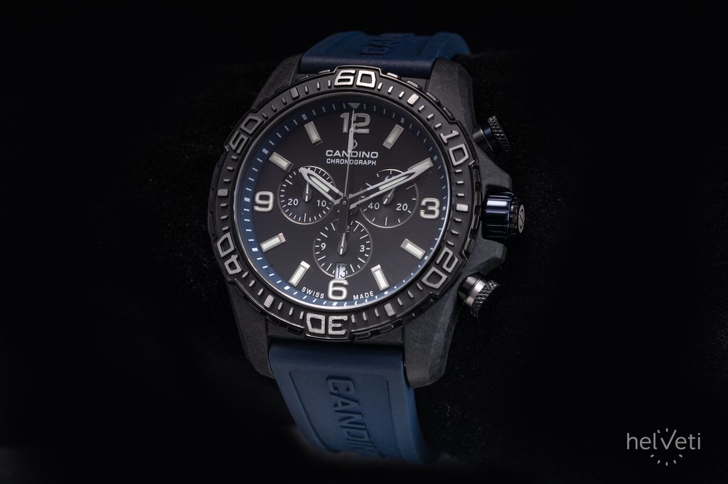 The case of the Candino Gents Chrono C4779/2 is made of carbon. Carbon is characterized by being very lightweight yet durable, colourfast and resistant to humidity and temperature changes. At the heart of the watch is the Swiss Ronda 5030.D battery-powered movement. It has a stopwatch and a practical date display. The hands and indices are coated with Superluminova luminescent coating, which ensures excellent legibility during low-light conditions. All protected by a scratch-resistant sapphire crystal.