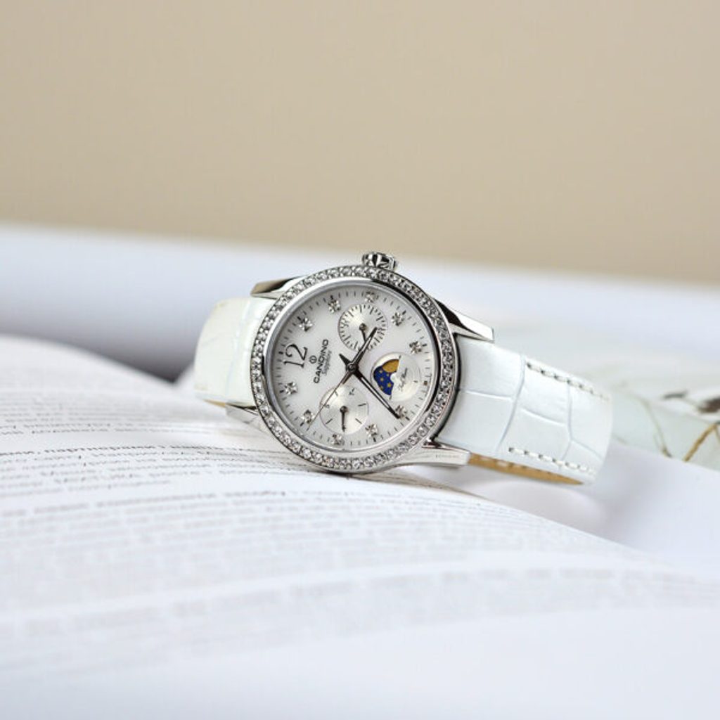 The luxurious look of the watch is set by the stainless steel case and pearl dial. This functional watch also displays the day of the week, the current day of the month and even features a moon phase indicator. There are also luminescence hands. All this is protected by saffir glass, which is extremely scratch-resistant. In addition, a battery Swiss movement is hidden inside the watch. The 5 ATM water resistance ensures that the watch will not be harmed by rain, hand washing or evening showers.