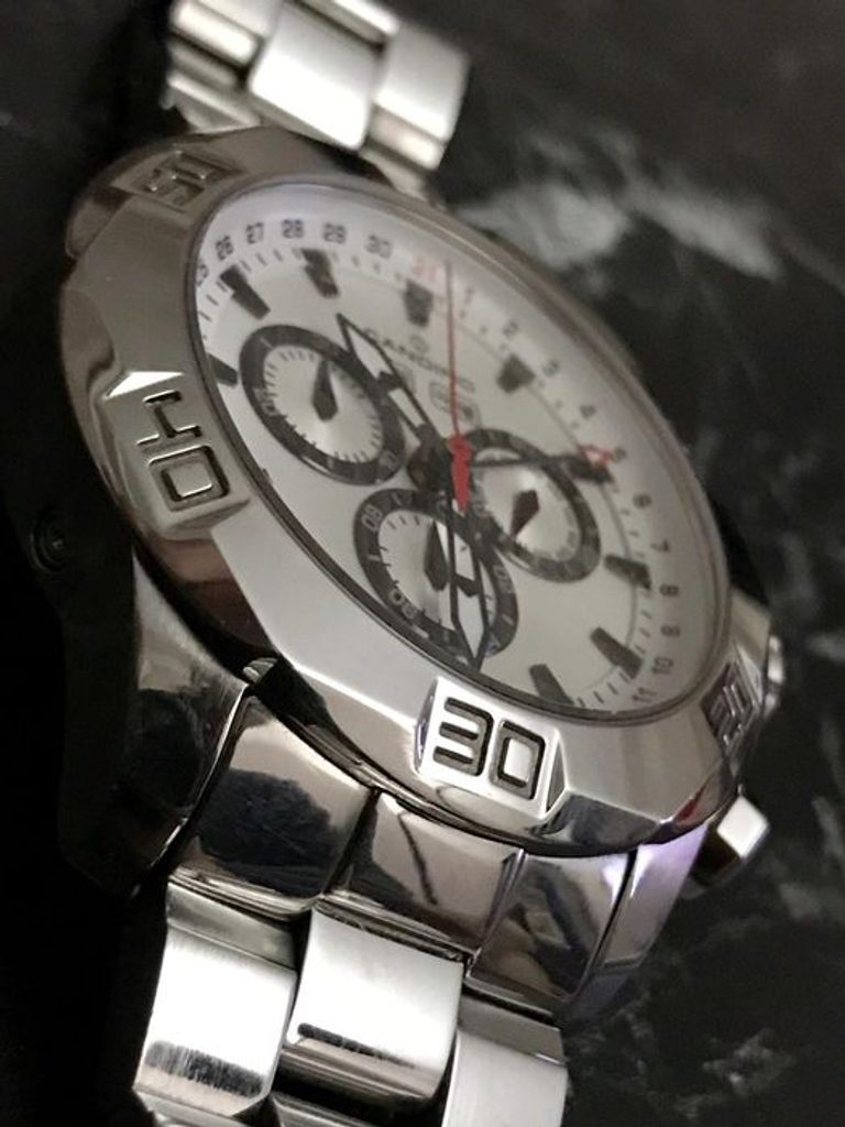At first glance, your attention will be drawn to the silver dial, which features three chronographs with stopwatch function. Furthermore, the dial is equipped with a practical month and day of the week indicator and an extended red hand that shows us the current day of the month. Another interesting feature are the hands, which are equipped with luminescence. Inside the watch is a battery-operated Swiss movement and everything is protected by a sapphire crystal.