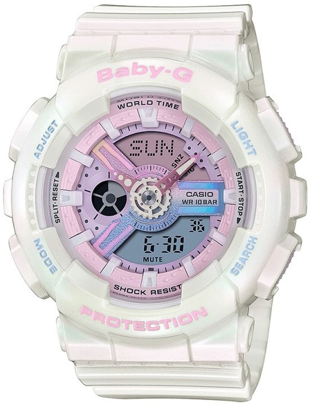 Casio Baby-G BA 110SC-2A is a model from the G-Shock Sea Glass Color Series, which has chosen to spice up its models by using colors typical of sea glass. The semi-transparent materials of the case covers and bracelets also complete the resemblance to sea glass. The glittering gold elements on the dials evoke the sun's rays reflecting off the surface of the glass on the beach.