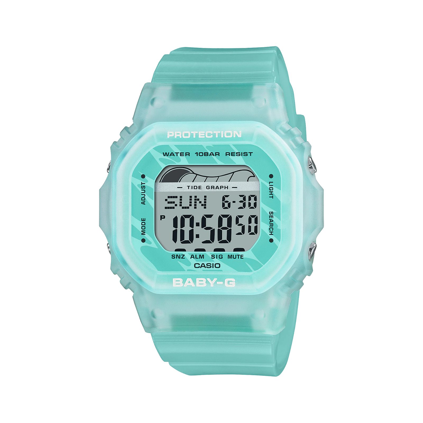 The Casio Baby-G BLX 565S-2 is a model from the G-Shock G-LIDE Surfing Series, which has chosen to spice up its models by using a tide chart display and moon phase. The use of summer colours is also typical of this series. A wave motif on the dial, colours inspired by surfboards and the sea - the feeling of summer atmosphere right on your wrist, wherever you are.