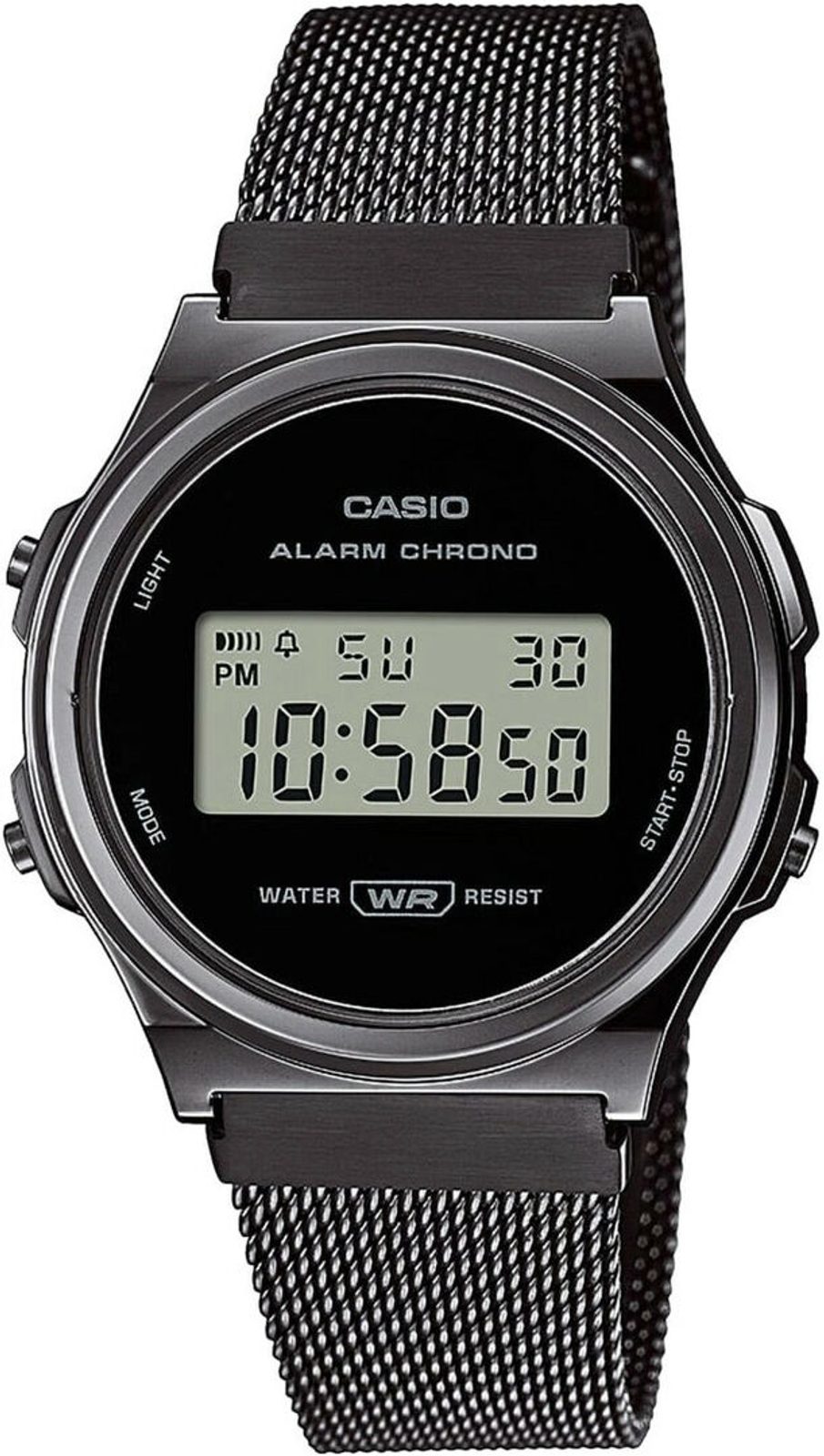 Casio A171WEMB-1A have a digital display that shows time, date, day of the week, stopwatch, alarm, 12/24 hour format and LED display illumination. The calendar on the watch is fully automatic, so you don't have to worry about adjusting it over time. The plastic case of the watch is complemented by a braided metal bracelet, called Mesh, which is popular not only for its design but also for its easy length adjustment, both with a black finish. The display is protected by a plastic glass. The case diameter of 36.6 mm makes it one of the smaller watches. The watch is water resistant - suitable at most for accidental contact with water during hand washing and rain.