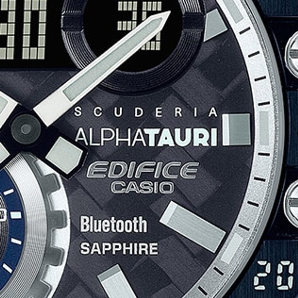 Casio Ediface ECB 10AT-1A is a watch born out of a partnership between Casio and the F1 Scuderia AlphaTauri racing team (the new name for the Scuderia Toro Rosso team). The connection with the Scuderia AlphaTauri team is not only referenced by the logo on the dial, clasp and bezel, but also by the colours used - white combined with dark blue and with light blue elements. The dial of the watch is made of 6K carbon, whose structure is similar to the material used for some elements of monoposts.