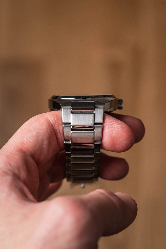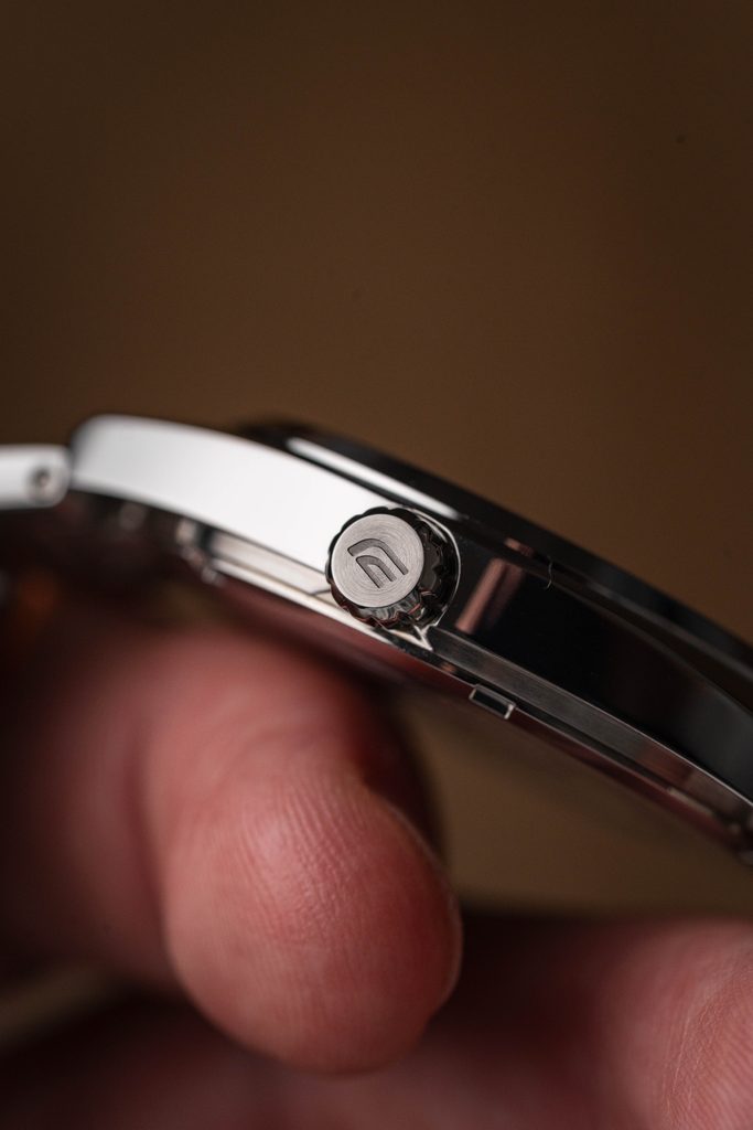 The dark, metallic-looking dial with a brushed effect catches the eye at first glance. It has hour positions set with embossed indices and the dark surface is pleasantly distorted by the coloured seconds hand. It is protected by a high-scratch-resistant sapphire crystal. The case of the watch is made of stainless steel and impresses with its cut, running from the edges to the centre of the case. It is complemented by a steel bracelet finished with a fold-over clasp. The watch is equipped with a date display at the 3 o'clock position. The advantage of the watch is its excellent clarity due to the use of distinctive indices and hands. The hands and hour indexes are coated with a luminescent layer, ensuring better legibility in low light conditions. The water resistance of the watch is 100 m - so it can handle swimming with ease. Thanks to the case diameter of 38.5 mm, it is classified as a smaller watch that can be suitable not only for gentlemen, but also for ladies.