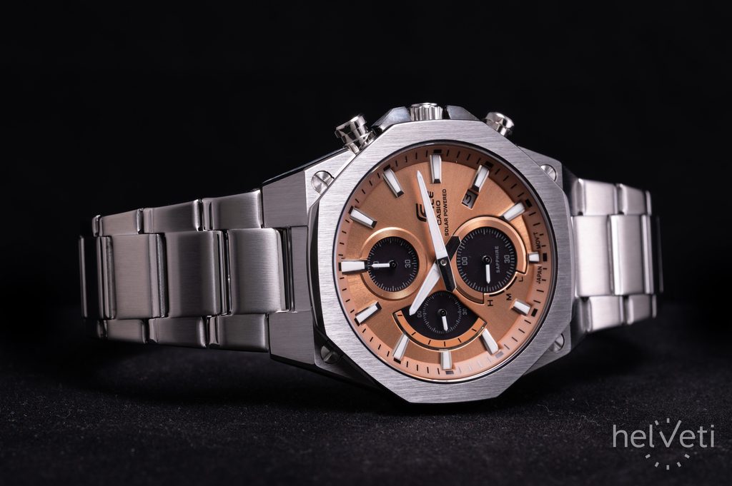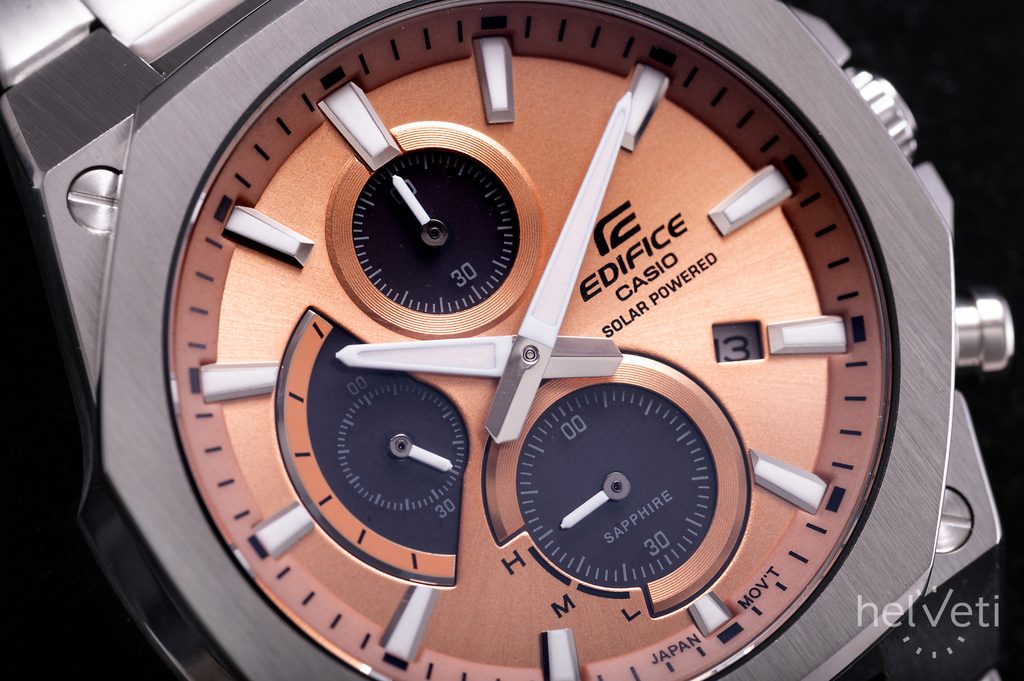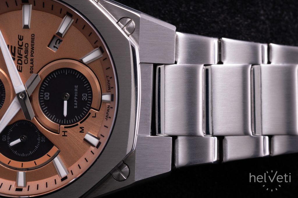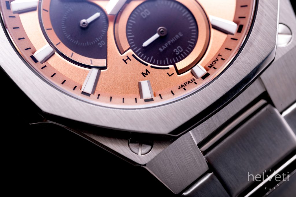 The case and bracelet of the watch are made of stainless steel. The clear salmon dial is protected by a sapphire crystal with an anti-reflective coating to improve readability in direct light. The hands and indices of the watch are coated with a luminescent layer, ensuring better legibility in low light conditions.