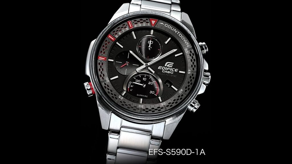 Casio Edifice EFS S590D-1AV features a data display at the fourth hour position and a chronograph function, the operation of which is shown by two clear sub-dials - a minute and seconds counter. The stopwatch can be controlled by side buttons - the upper stopwatch starts and stops, the lower stopwatch resets the measured values. The watch can measure up to thirty-minute intervals using the stopwatch and up to one-hour intervals thanks to the internal countdown lunette, which can be operated with the crown at the eight o'clock position. The watch's steel case is complemented by a steel bracelet, which is longer lasting than the straps and makes the watch more versatile. The clear black dial is protected by a sapphire crystal. The water resistance of this model is 100 m - so you can swim with the watch without worry. The advantage of the watch is solar power, in which the watch battery is recharged by light. The battery has a longer lifespan than a regular battery, eliminating the need for regular 2 - 3 year replacements. The 45.3 mm case diameter makes it a large watch.