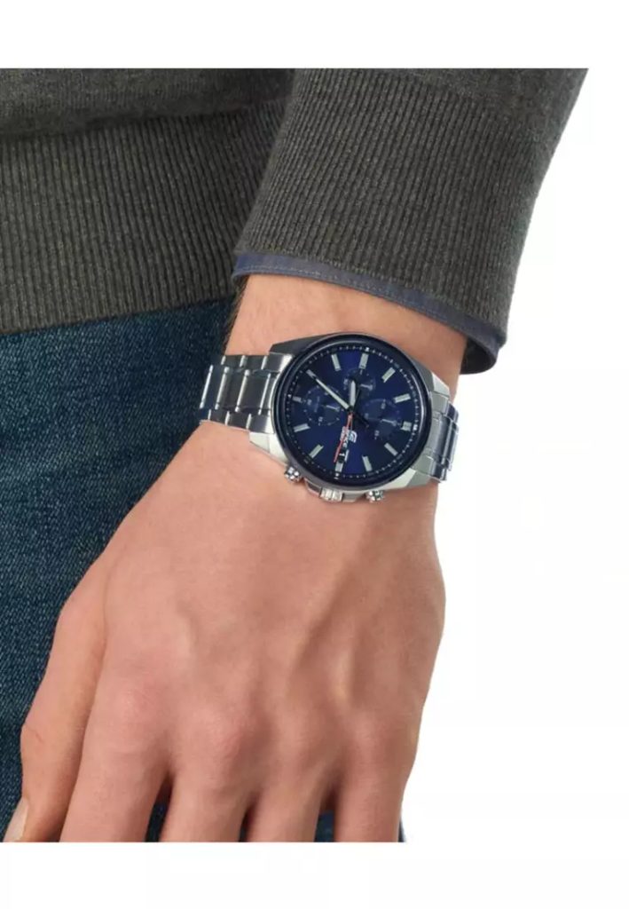 Model Casio Edifice The EFV 610DB-2AV features a date indicator at the 3 o'clock position, which delights with the use of a dark wreath with light printing. It also offers a chronograph function, the operation of which is shown by clear sub-dials - a minutes counter at 9 o'clock and a seconds counter at 6 o'clock. The stopwatch is capable of measuring to 1/10 second (counter at 12 o'clock). The case and bracelet of the watch are made of steel. An interesting feature is the lunette with a blue IP surface finish. The dial is protected by a mineral glass. The water resistance of this model is 100 m - so you can swim with the watch without any worries. The diameter of the watch case is 43.8 mm.