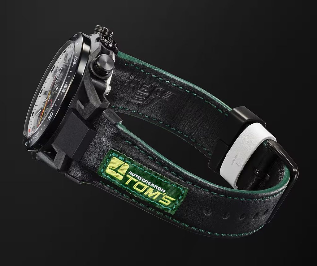 The anniversary edition pays tribute to the KP47 Starlet race car that made the TOM'S Racing team an overnight sensation with an impressive run of race wins in the 1970s: 22 pole positions, 20 victories and three series championships. The design of the Casio Edifice Sospensione EFS-S641TMS-1AER TOM'S 50th Anniversary Edition watch is laced with references to this famous car, as well as its colours white, red and green.