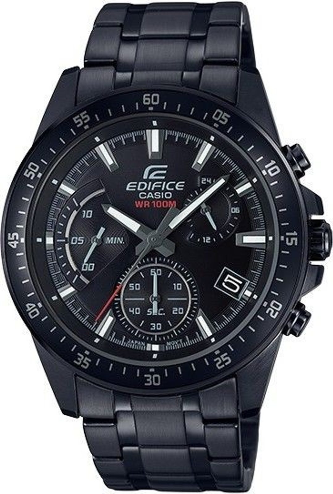 TheCasio Edifice EFV 540DC-1A has many functions, such as adate display , stopwatch, and 24-hour cycle display. Its case is made of stainless steel with a black PVD finish. The dial is protected by a mineral glass. Thewater resistance of the watch is 100M, so it is suitable for normal swimming, snorkeling, or water sports. The 44 mm case diameter makes it one of the larger watches.