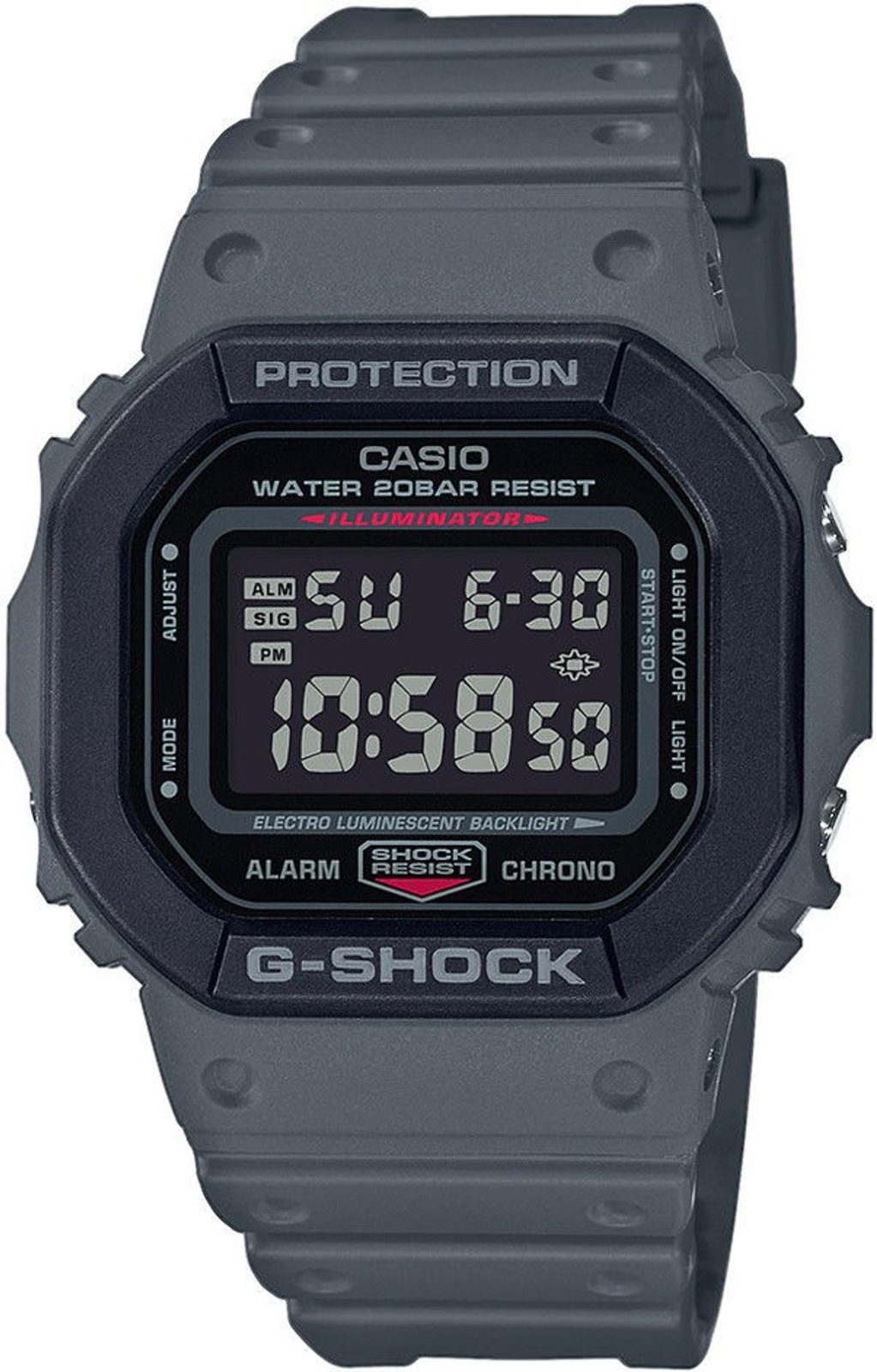 Casio G-Shock DW 5610SU-8 is a new addition to the G-Shock Utility Color Series, which uses tactical colors and has now decided to spice up the models with a case created by drilling, making the case a different color than the lunette. The use of an inverted digital LCD display is also typical of this series. The Casio G-Shock DW-5610SU-8ER have a digital dial that displays the date, day of the week, stopwatch, alarm clock and many other functions. The display lights up to alert you when the countdown is complete, the hour signal, the alarm time set, etc. The watch case, including the strap, is rubber. The dial is protected by a mineral glass. The diameter of the case 43.8 mm makes it one of the larger watches. Water resistance of this model is 200 m, so you can easily swim and dive with the watch without breathing apparatus.