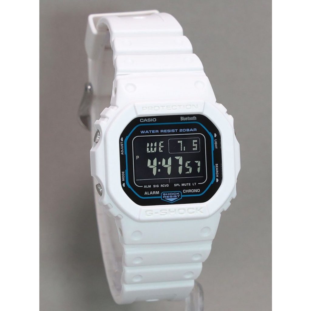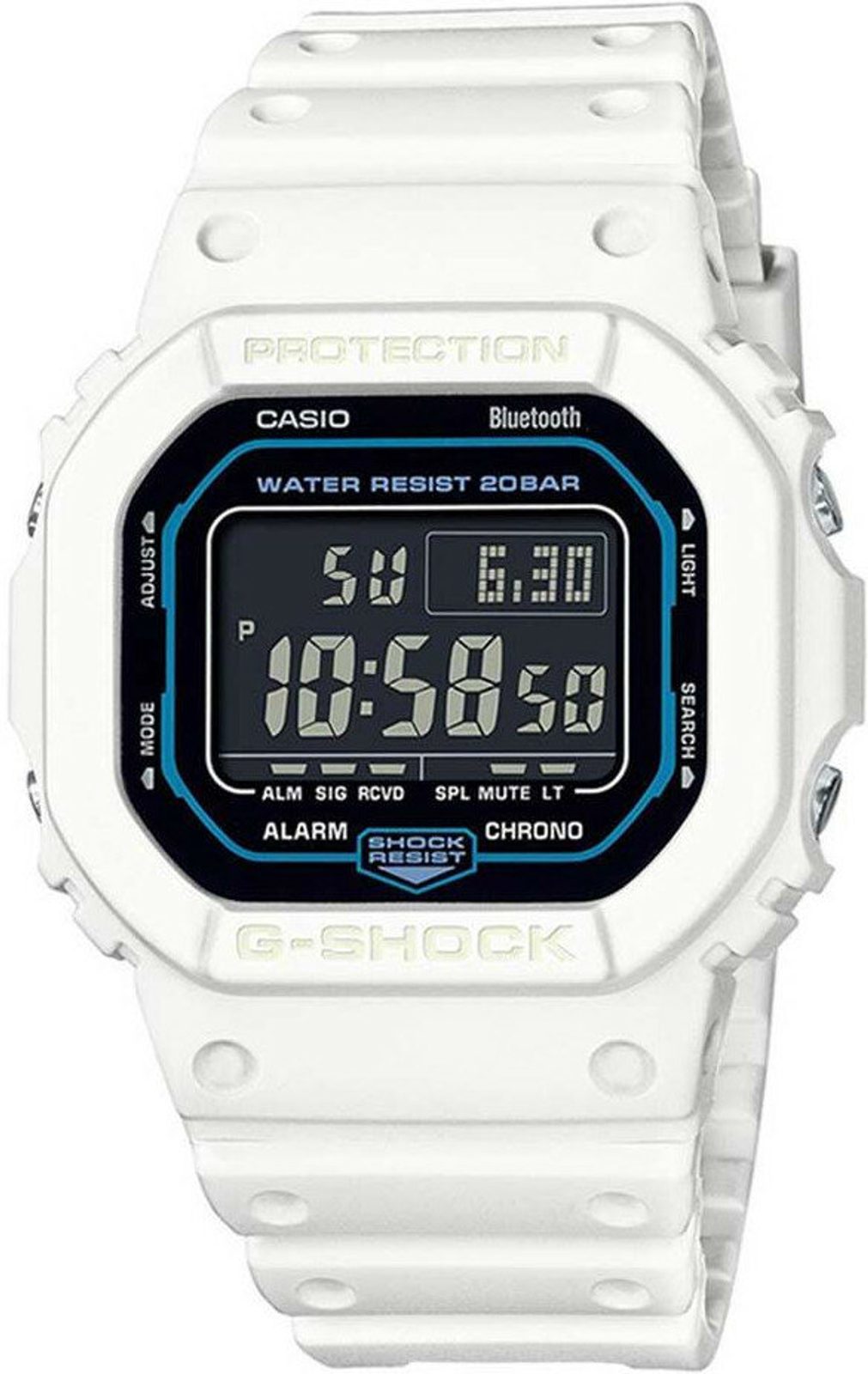 Casio G-Shock DW-B5600SF-7ER SCI-FI World Series is a men's sports watch that offers a multitude of features combined with a modern design. The clean white design, inspired by the world of science fiction, is accentuated with hints of blue and purple. The bezel is printed in glow-in-the-dark colour, from which the G-SHOCK logo will shine out at you.