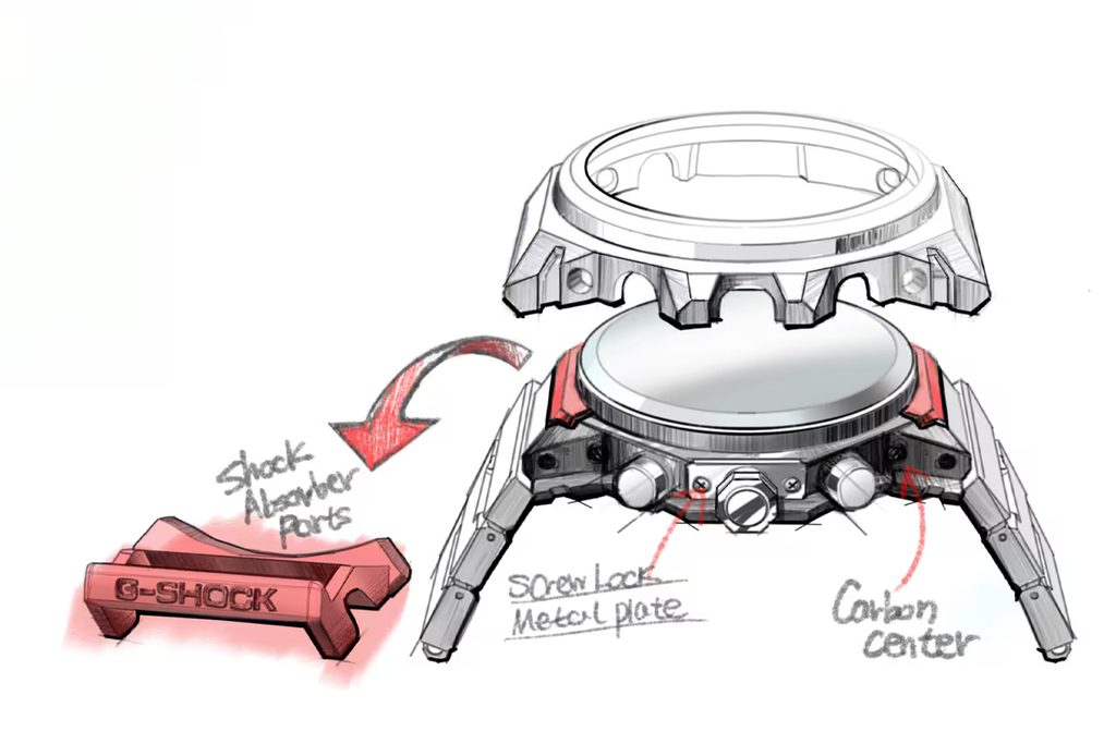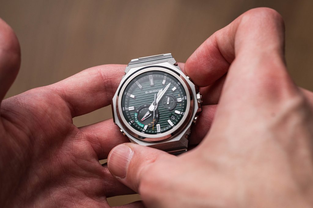 The high durability of the case is ensured by the combination of the metal case and the internal Carbon Core Guard construction. The inner case is made of resin, reinforced and strengthened with carbon fibre and allows the case height to be reduced. The aforementioned combination allows for a more compact and lighter unit. The watch case is complemented by a steel bracelet.